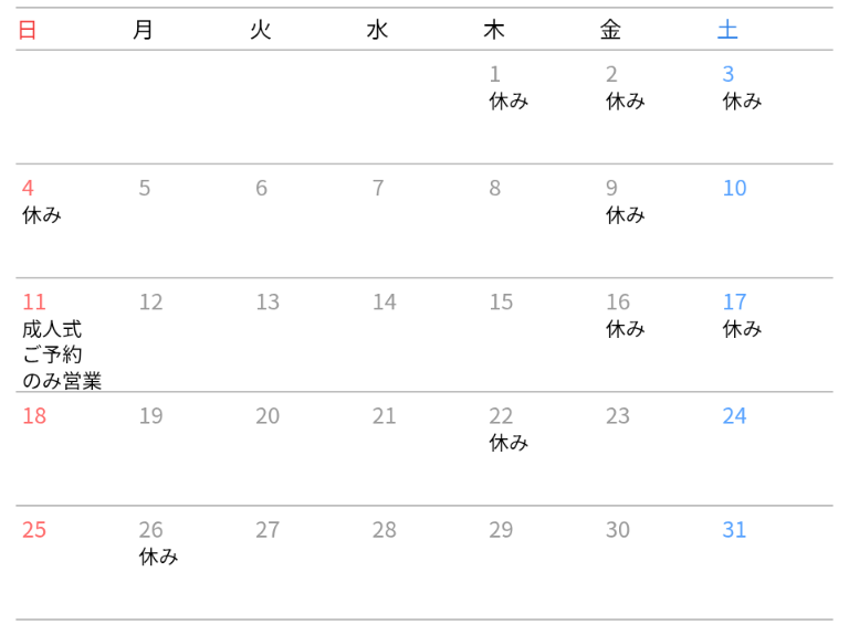 1月のお休みのお知らせ